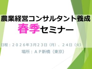 【セミナー】2025年度春季セミナーが開催されます 2025年11月12日 | コメントはまだありません | セミナー 3月23日(月)~24日(火)の日程で農業経営コンサルタント養成セミナーが開催されます。 今回も前回にひきつづき、会場は東京の「AP新橋」とzoomのハイブリッドにて行います。 会員の皆さまのご参加をお待ちしております! もっと読む »